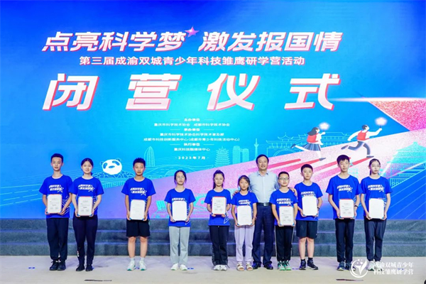 7月14日,第三届成渝双城青少年科技雏鹰研学营活动在重庆科技馆圆满落幕。重庆市科协党组书记、副主席李雷霆出席闭营活动并为优秀营员代表颁发荣誉证书。重庆市科协党组成员、二级巡视员牛杰出席并为优秀科学导师代表颁发荣誉证书。