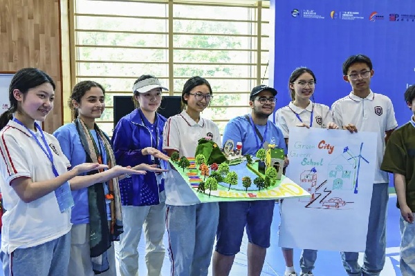 6月12日,在第九届“一带一路”青少年创客营活动中,成都金苹果锦城第一中学学生和巴基斯坦代表队的学生拿着作品合影。新华社发