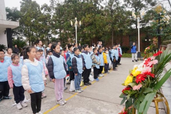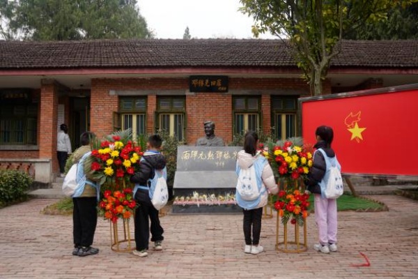 在邓稼先故居前,四名青少年代表抬着花篮缓步上前敬献鲜花,每一步皆显少年对英雄的崇敬,随后,全体青少年肃立齐唱国歌,并庄严宣誓。