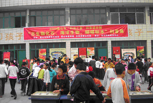 为深入贯彻落实科学发展观,全面实施《全民科学素质行动计划纲要》,由眉山市科协、市教育局、共青团眉山市委共同举办的2008“科技之春”科普进校园活动于2008年4月14日在眉山市第一小学正式拉开序幕。 本次活动主题为“古生物化石、海洋生物、蝴蝶标本”科普展。此次活动的开展以生动的实物标本和翔实的科学知识给学生们上了一堂生动的科普课。让他们了解生物进化、人类起源、生命诞生方面的知识,激发了他们从小爱科学、学科学的兴趣,树立了他们从小热爱自然、保护环境的意识。