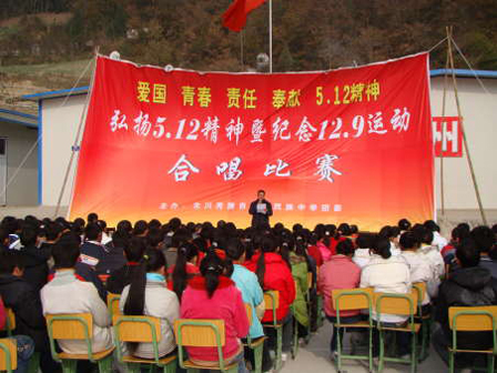 12月9日,来自北川民族中学的601名师生,顶着寒风,聚集在该校异地而建的板房校园操场里,开展了纪念“12•9”运动签名活动,发出了“趁我们还年轻”的倡议。师生们用歌声唱出了心声:点亮用心关注的灯,才能用健康的形象、纯净的心灵,创造出积极而美好的人生;点亮知心自助的灯,用自助促进成长;点亮开心互助的灯,因互助而不再孤独…… “5•12”特大地震和堰塞湖,让北川县民族中学昔日美丽的校园不复存在,一些学生失去了亲人。为此,学校成立了心理健康教育工作组,先后开展了“手拉手”、“自己做朋友”等主题活动。这些活动极大地鼓舞了学生们的热情,帮助他们树立了自信。